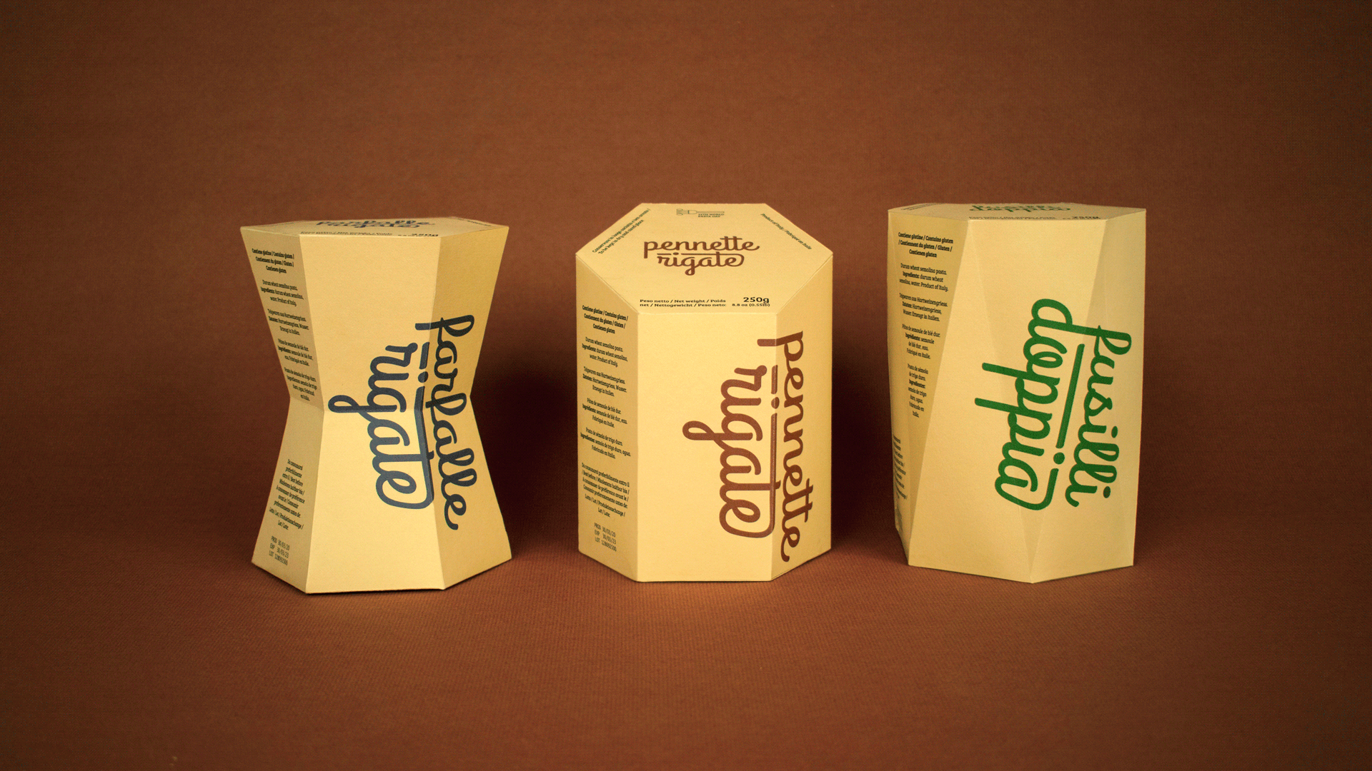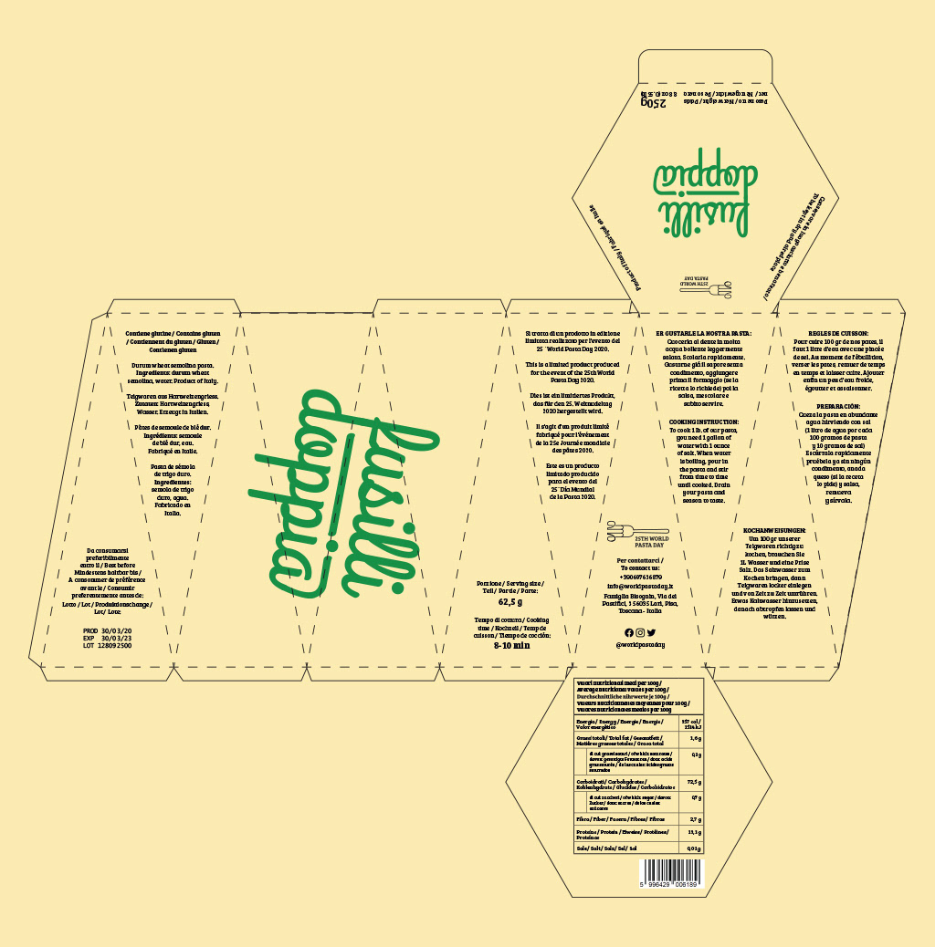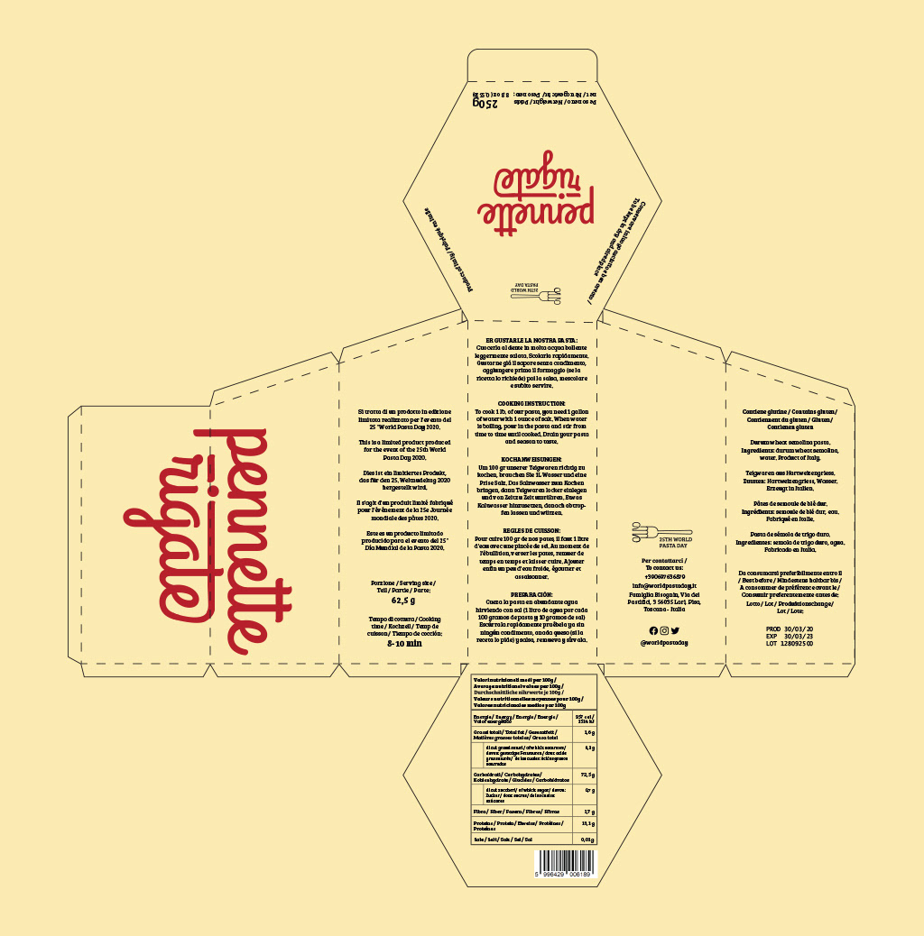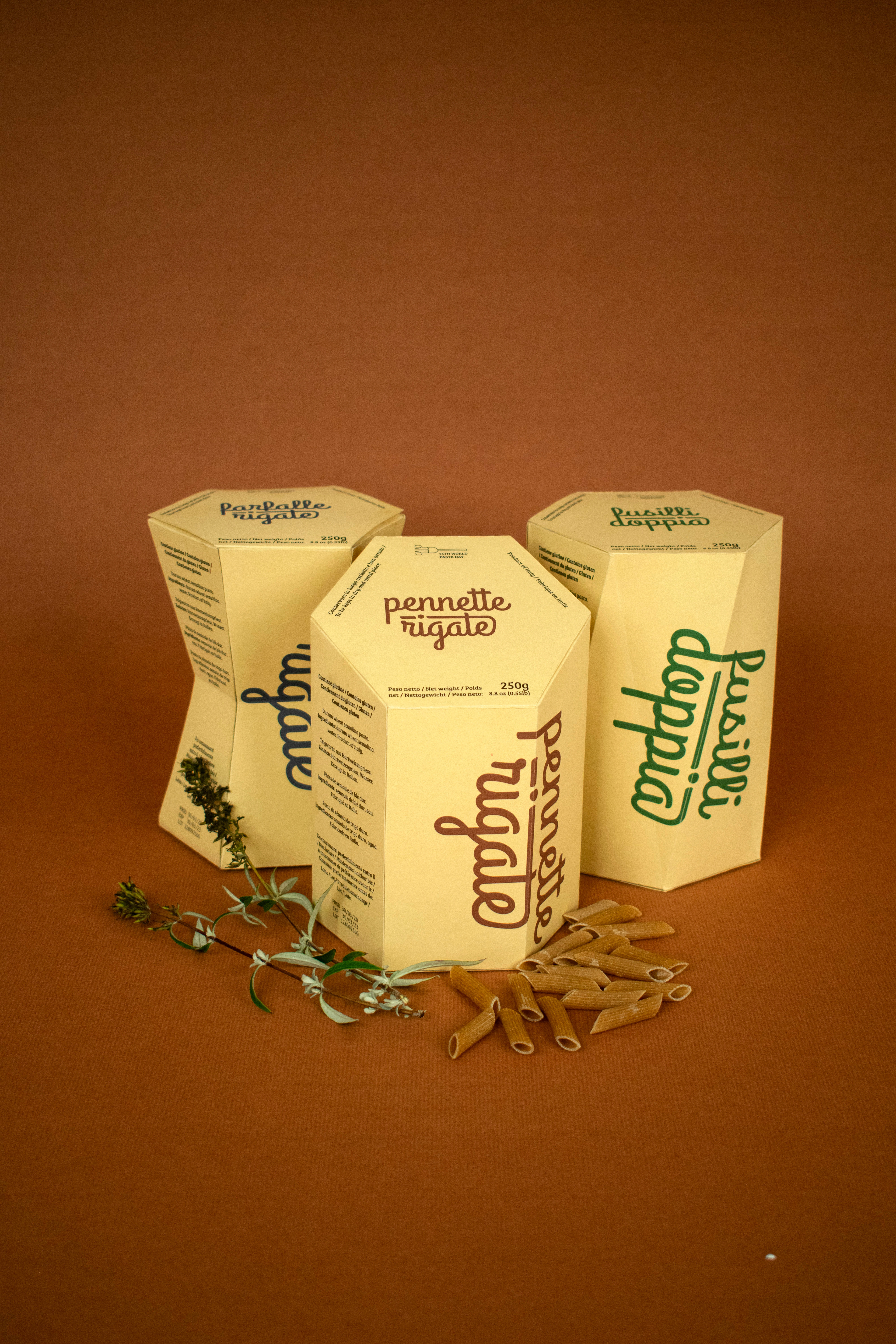 The 25th World Pasta Day took place on the 25th of October, 2020, for which I created a visual identity accompanied by three packaging designs for a fictional product family of Italian pasta types. The campaign aimed to highlight the exciting, out-of-the-box opportunities behind such basic ingredients as pasta and therefore used the same principle in its visual design. Combining the three primary colors, the material of regular paper, and typography, the outcome displays a distinctive and decorative product that communicates that elemental components can make exquisite results. The boxes take the shape of each pasta type they contain, bringing variety and aesthetics to the otherwise straightforward print design.