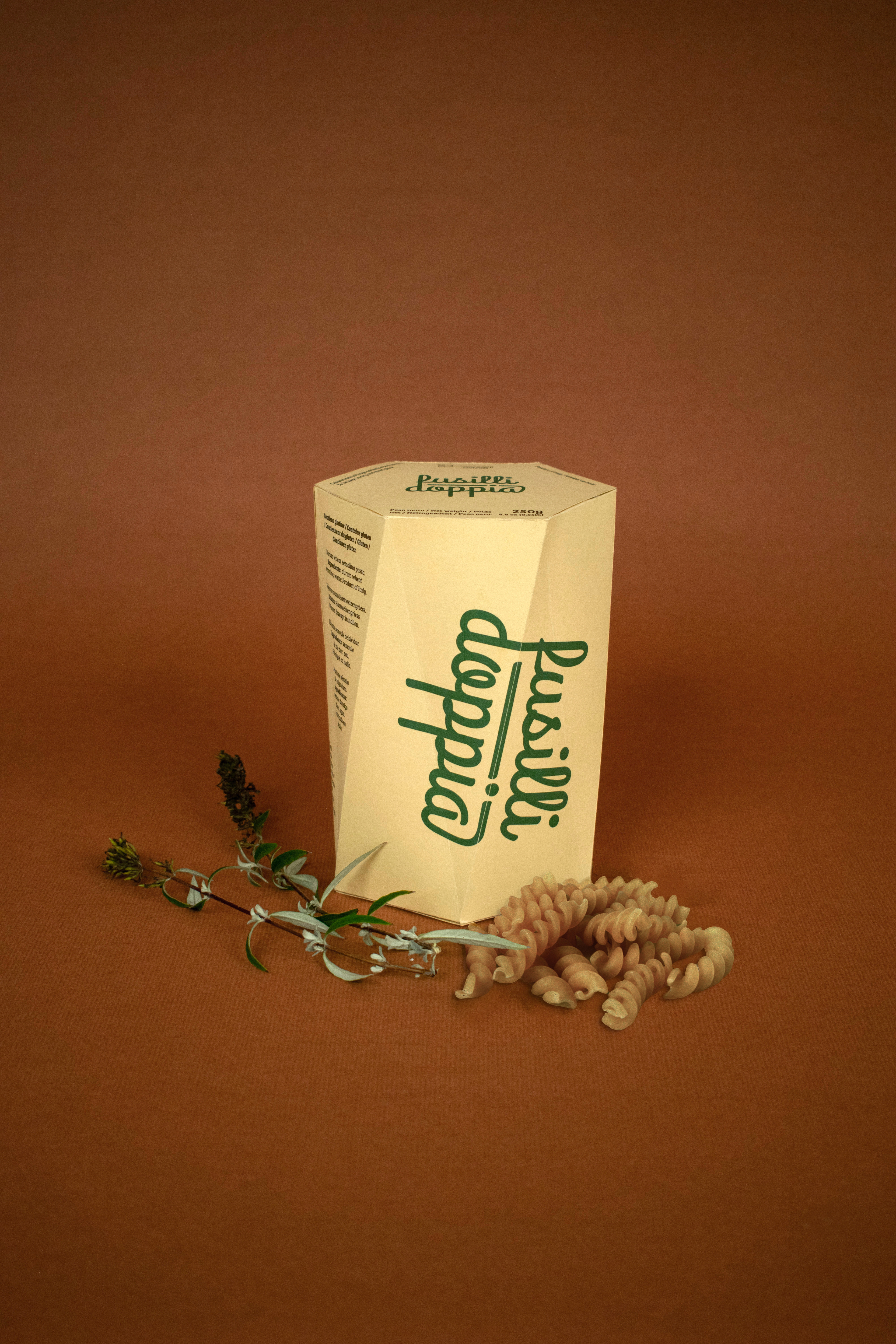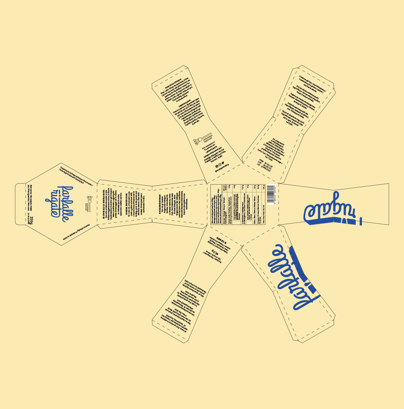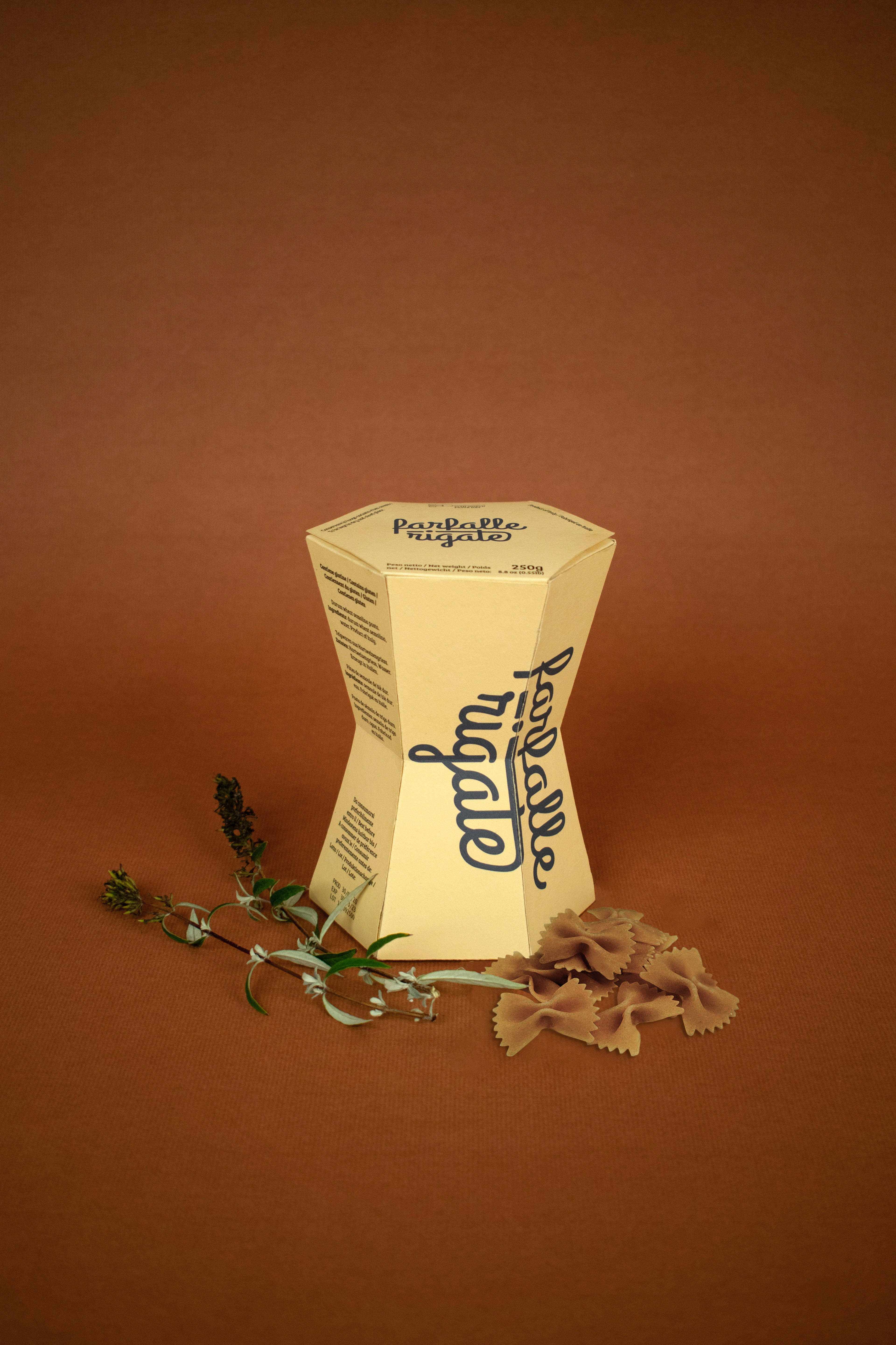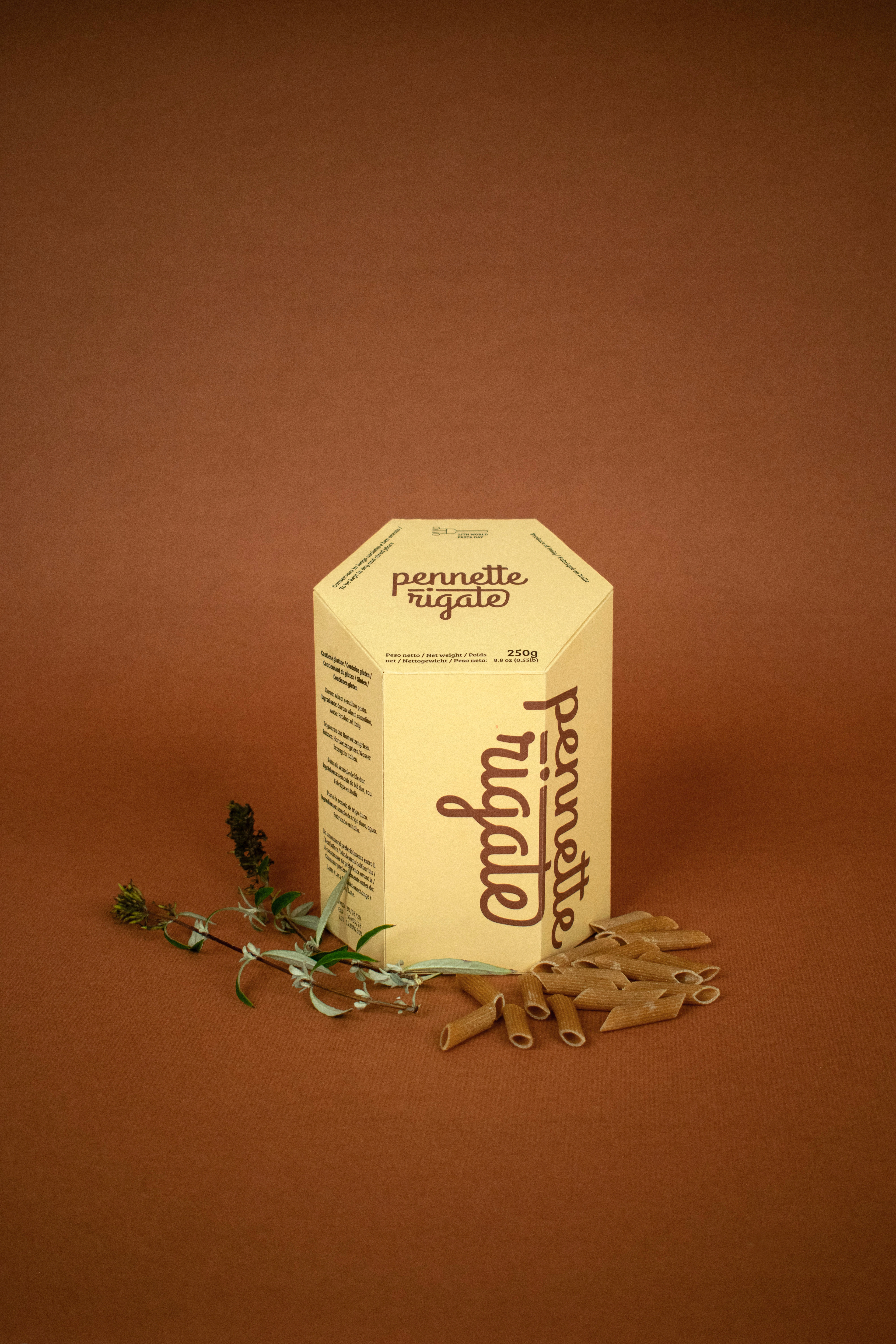 The 25th World Pasta Day took place on the 25th of October, 2020, for which I created a visual identity accompanied by three packaging designs for a fictional product family of Italian pasta types. The campaign aimed to highlight the exciting, out-of-the-box opportunities behind such basic ingredients as pasta and therefore used the same principle in its visual design. Combining the three primary colors, the material of regular paper, and typography, the outcome displays a distinctive and decorative product that communicates that elemental components can make exquisite results. The boxes take the shape of each pasta type they contain, bringing variety and aesthetics to the otherwise straightforward print design.